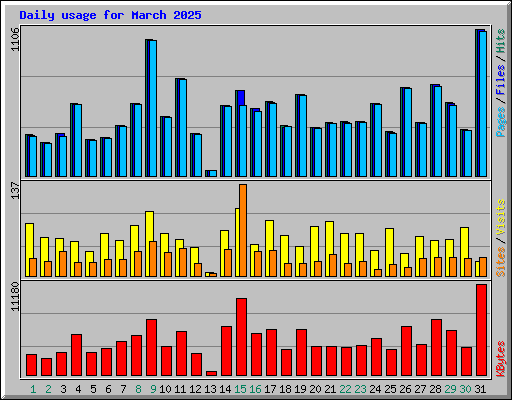 | Day | Hits | Files | Pages | Visits | Sites | KBytes | ||||||